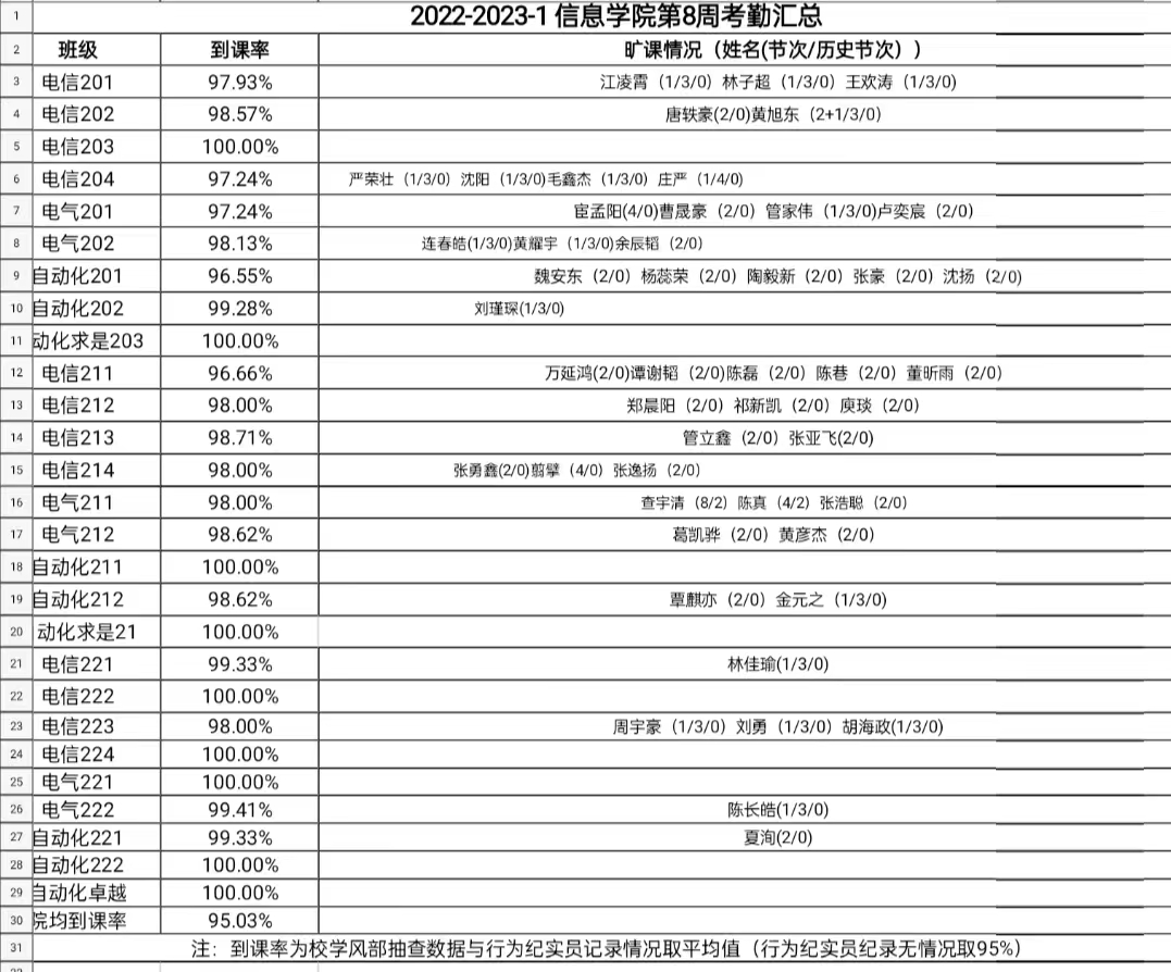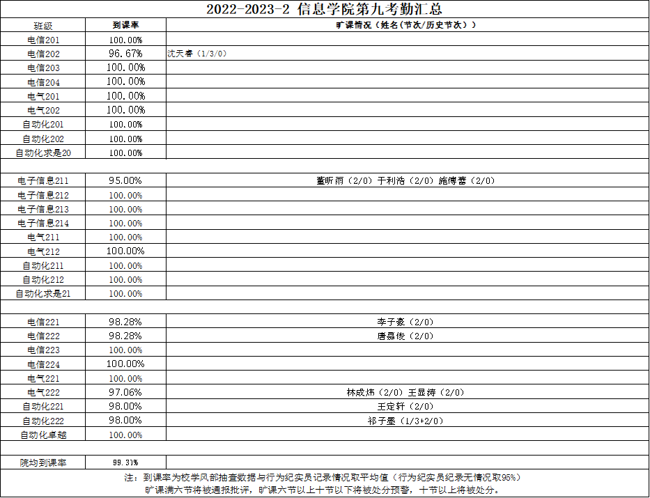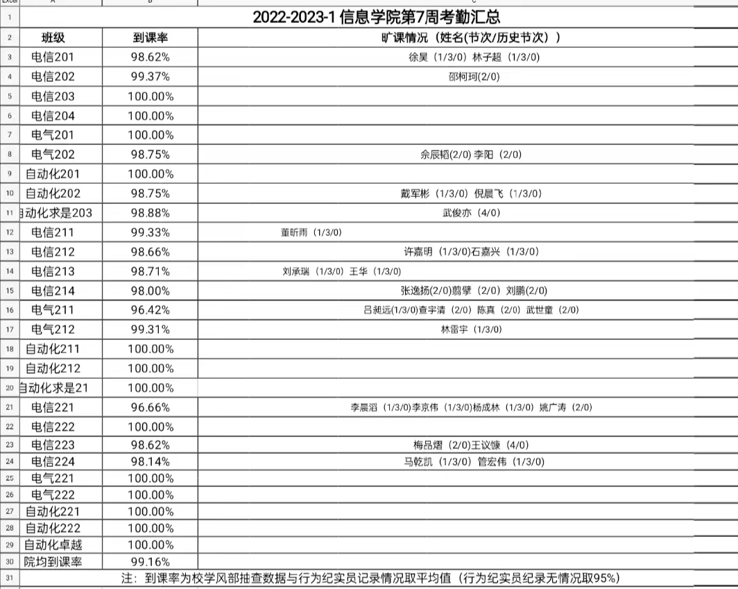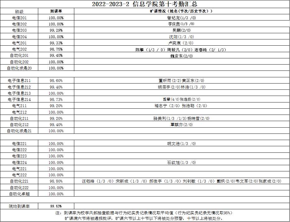 根据班级行为纪实员上报、学院学风部自查、学校学风部抽查结果,现将本学期第7-10周学风考勤情况予以公示,旷课的同学请及时核对情况,如有请假等原因请在公示期内说明,否则按照旷课处理;到课率低的班级请严格要求,加强班级管理,加强学风建设。