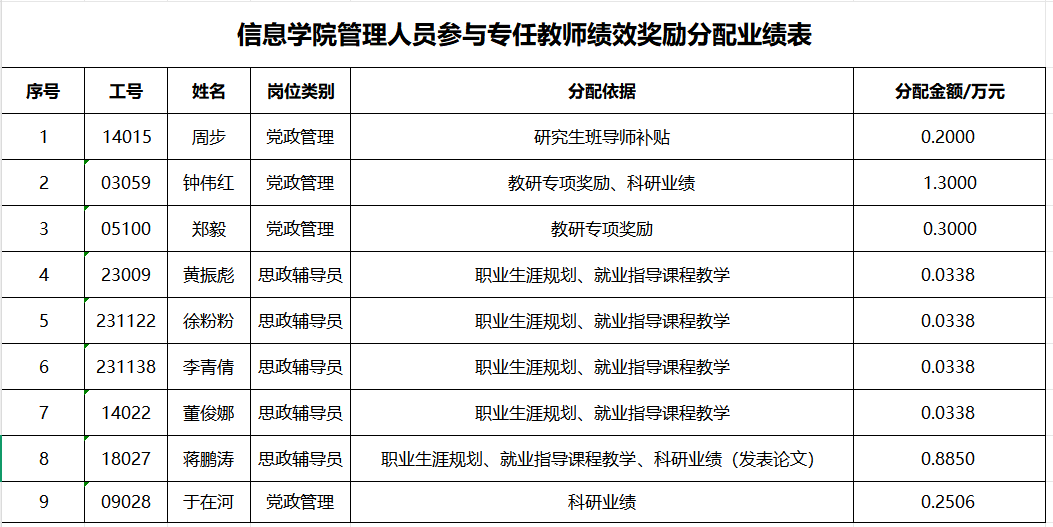 根据学校人事处关于2024年度绩效(考核)奖励发放说明的要求,按照学院第六轮聘岗期间年终考核奖励分配方案,现对学院行政管理岗(含思政辅导员)参与教师业绩分配结果进行公示: