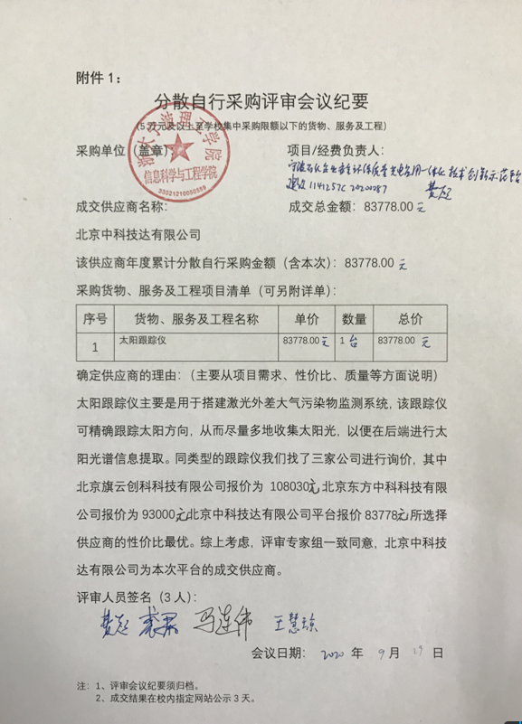 信息科学与工程学院太阳跟踪仪分散自行采购项目成交结果的公示